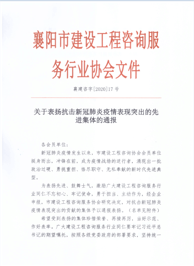 公司被襄陽市建設(shè)工程咨詢服務(wù)行業(yè)協(xié)會評為“抗擊新冠肺炎疫情”表現(xiàn)突出的先進(jìn)集體