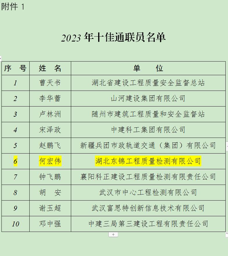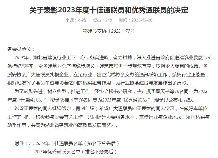 何總榮獲 湖北省建設(shè)工程質(zhì)量安全協(xié)會2023年度“十佳通聯(lián)員”