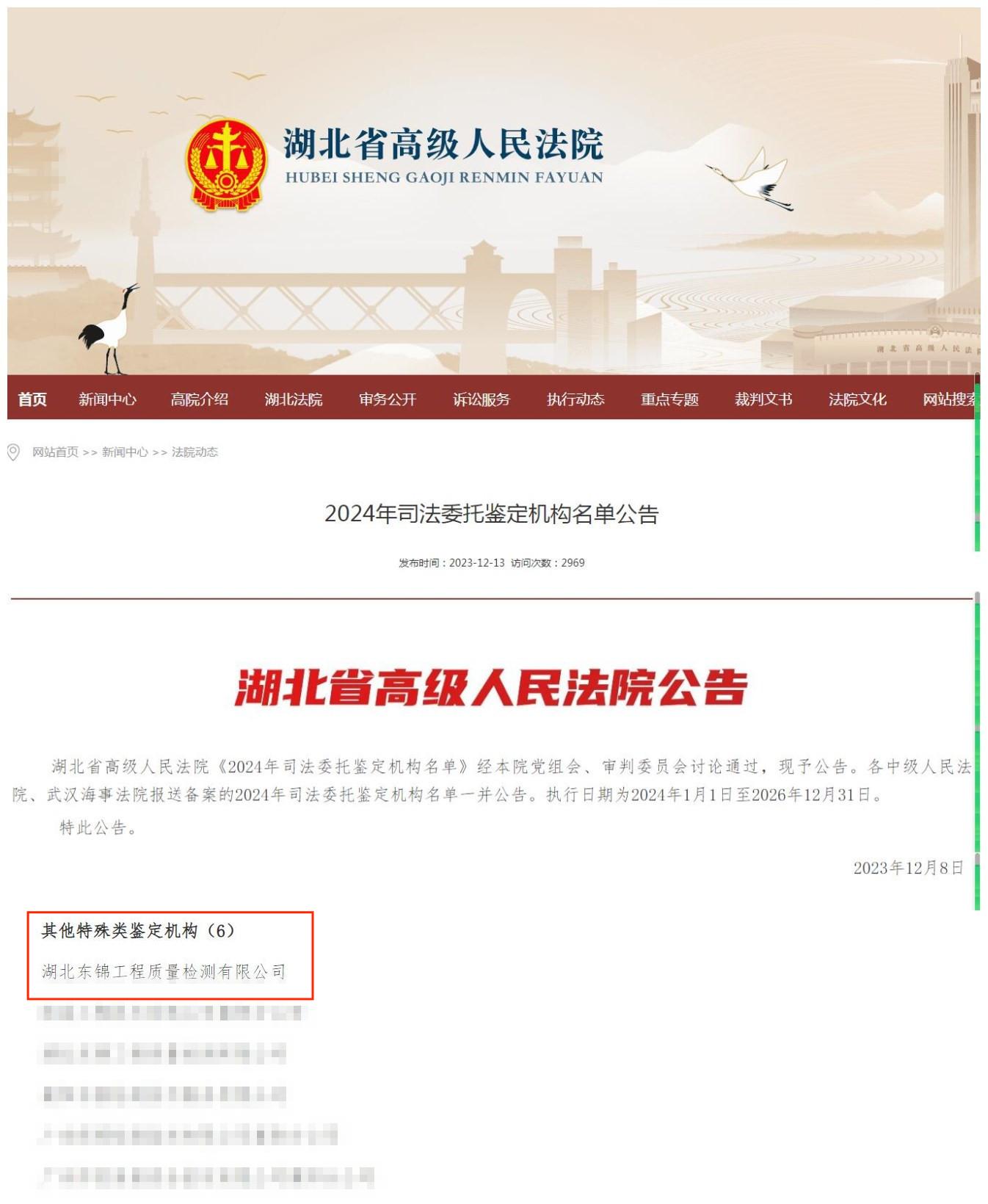 公司入選湖北省高級人民法院《2024年司法委托鑒定機構名單》