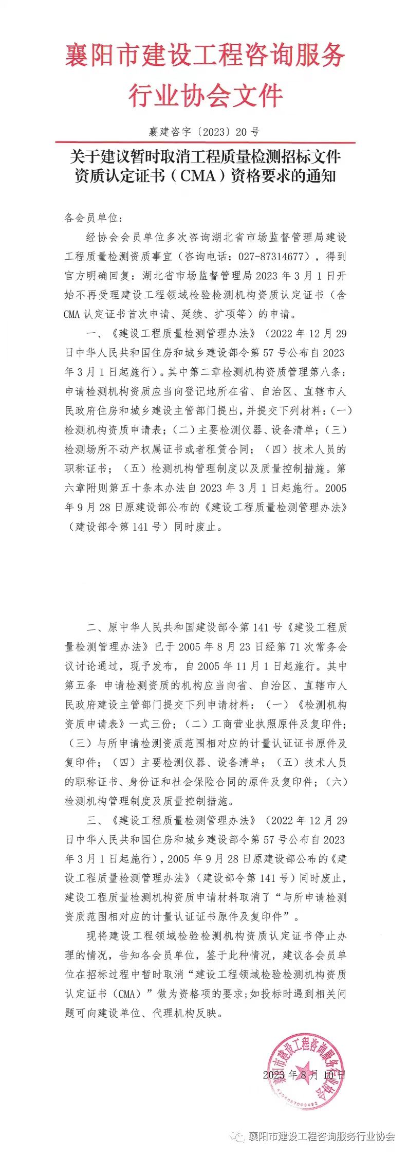 關于建議取消工程檢測招標文件資質(zhì)認定證書(CMA)要求的通知