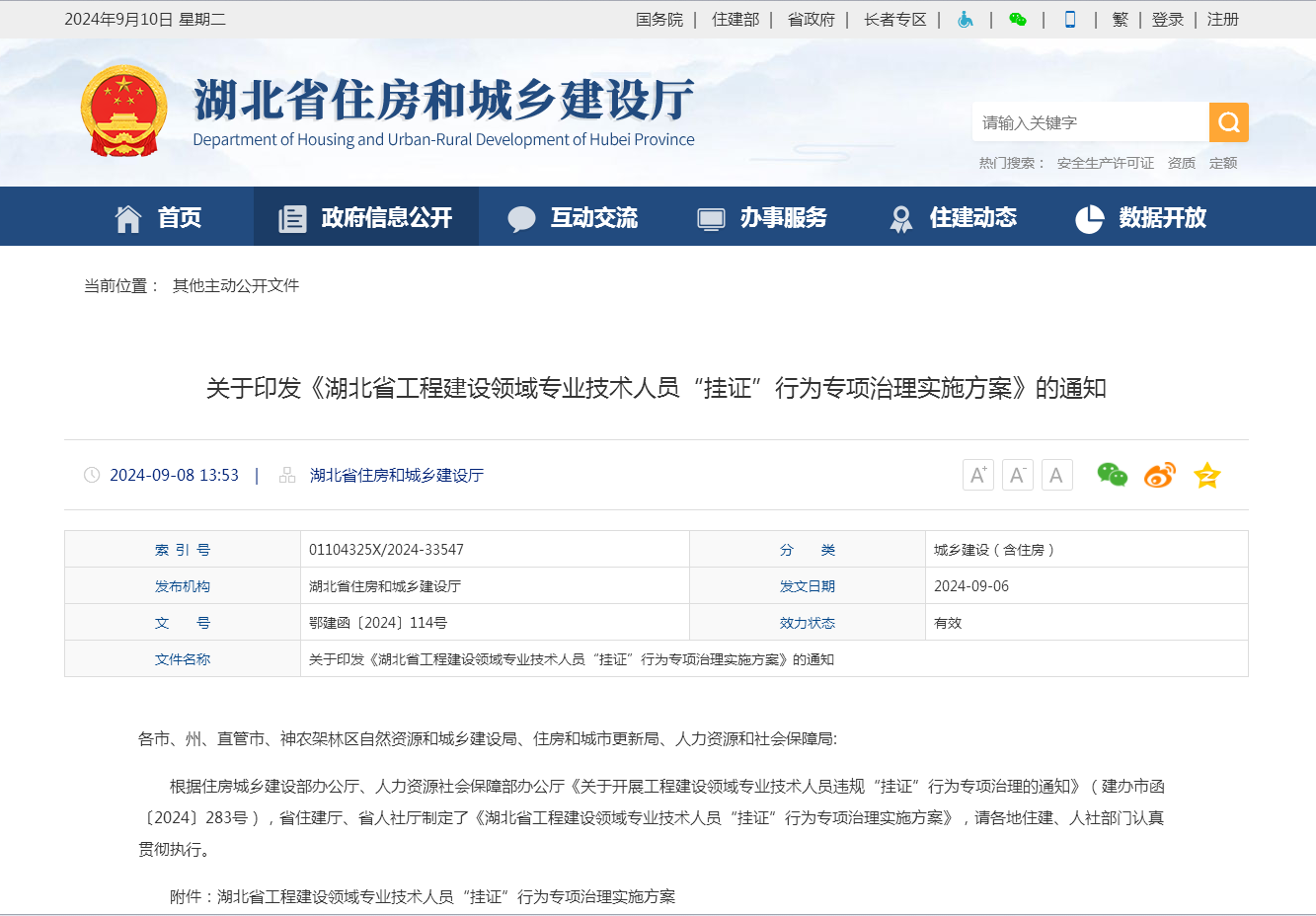 關于印發(fā)《湖北省工程建設領域專業(yè)技術人員“掛證”行為專項治理實施方案》的通知