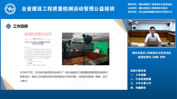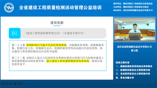 5月29日下午2:30,線上公益培訓(xùn)開始,武漢富思特創(chuàng)新信息技術(shù)有限公司總經(jīng)理謝玉超對新版湖北省建設(shè)工程質(zhì)量檢測監(jiān)管系統(tǒng)功能進(jìn)行詳細(xì)介紹,新版湖北省建設(shè)工程質(zhì)量檢測監(jiān)管系統(tǒng)運(yùn)用數(shù)字化手段和AI技術(shù),實(shí)現(xiàn)對檢測資質(zhì)和檢測活動的動態(tài)化、精準(zhǔn)化監(jiān)管,構(gòu)建了待辦中心、預(yù)警中心、決策中心三大核心功能模塊,實(shí)時(shí)監(jiān)測異常情況,并向監(jiān)管部門推送預(yù)警信息,助力各級監(jiān)管人員高效履職。系統(tǒng)還創(chuàng)新引入信用監(jiān)管機(jī)制,結(jié)合檢測機(jī)構(gòu)及從業(yè)人員的信用評價(jià),實(shí)施差異化監(jiān)管,推動行業(yè)自律。 省質(zhì)安總站質(zhì)監(jiān)科工程師雷鳴對湖北省建設(shè)工程質(zhì)量檢測行業(yè)管理工作進(jìn)行了回顧,介紹了以后一段時(shí)期要開展的主要工作及工作思路,比如:落實(shí)分類監(jiān)管、對墻體保溫材料整治與住建部住宅工程常見問題重點(diǎn)整治、修訂地標(biāo)《房屋市政工程質(zhì)量檢測項(xiàng)目分類規(guī)范》,通過提高市場行為、技術(shù)行為從而提高行業(yè)管理標(biāo)準(zhǔn)化水平、探索數(shù)智賦能和開展行業(yè)調(diào)研等工作,最后,對前期征集的大家關(guān)注的特別是新舊資質(zhì)過渡期間存在的相關(guān)問題進(jìn)行答疑,并呼吁檢測機(jī)構(gòu)堅(jiān)持初心,切實(shí)履行好為工程質(zhì)量保駕護(hù)航的使命。 這次培訓(xùn)對于全省監(jiān)督機(jī)構(gòu)、檢測機(jī)構(gòu)平穩(wěn)完成新舊資質(zhì)過渡、規(guī)范檢測行為、在新資質(zhì)標(biāo)準(zhǔn)下推動行業(yè)發(fā)展具有很強(qiáng)的指導(dǎo)作用。全省建設(shè)工程質(zhì)量監(jiān)督人員、檢測機(jī)構(gòu)相關(guān)人員計(jì) 7600人參加了本次培訓(xùn)。 此次培訓(xùn)由武漢富思特創(chuàng)新信息技術(shù)有限公司承辦。